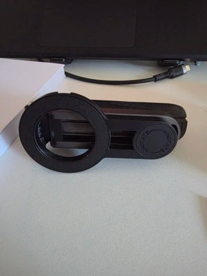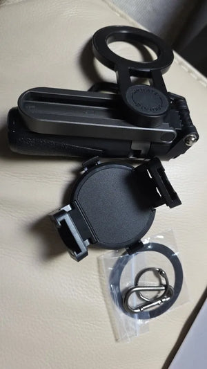 Der Halter passt für die meisten Smartphones und kompakte Kameras. Magnetische und verstellbare Elemente sichern das Gerät fest, auch bei größeren Modellen.